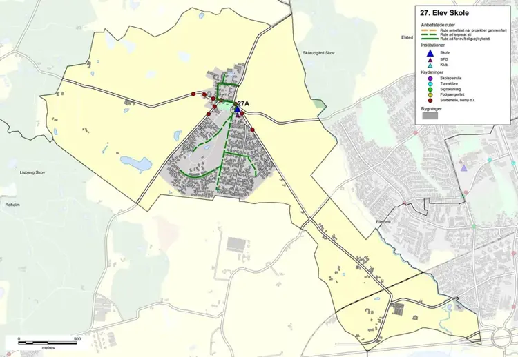 På kortet nedenfor viser vi de skoleveje, som vi anbefaler til børnene. Husk: Øvelse gør mester, og det er en god ide, at du øver skolevejen sammen med dit barn.